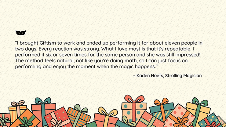 "I brought Giftism to work and ended up performing it for about eleven people in two days. Every reaction was strong. What I love most is that it's repeatable. I performed it six or seven times for the same person and she was still impressed! The method feels natural, not like you're doing math, so I can just focus on performing and enjoy the moment when the magic happens."
